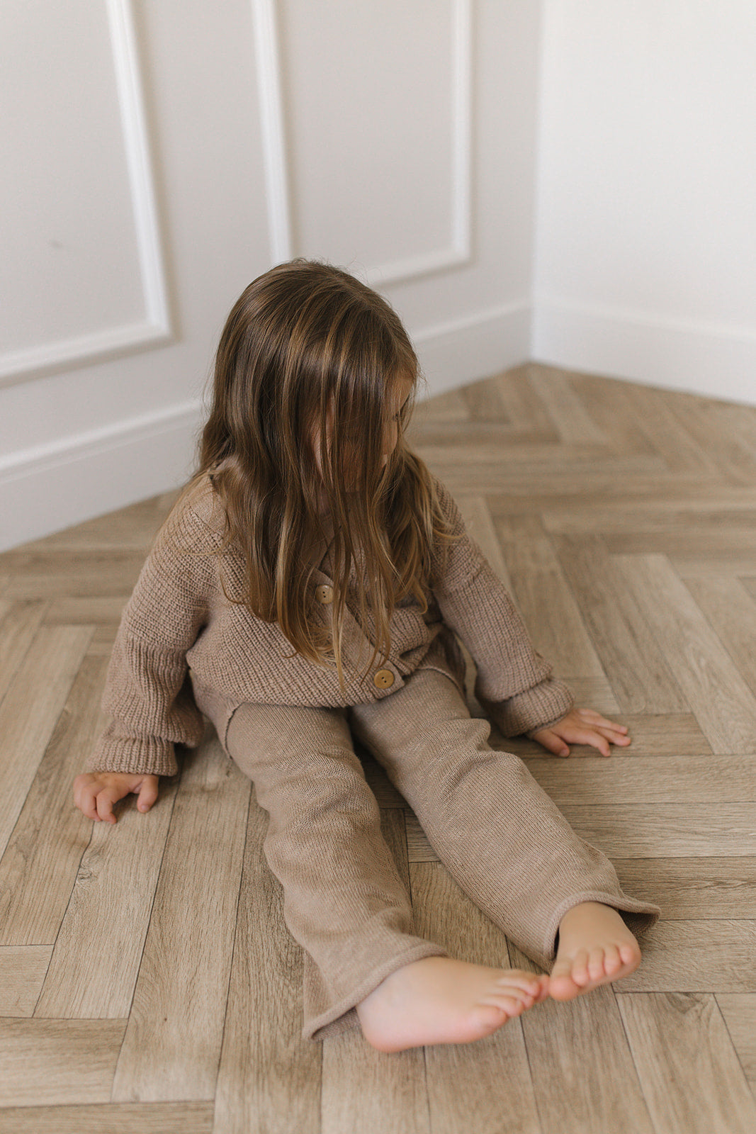 Wide leg trousers, elasticated at the waist with a rolled hem. Made from 100% cotton with a cosy Teddy texture. Matching cardigan available and can also be mixed and matched with other items from the collection.