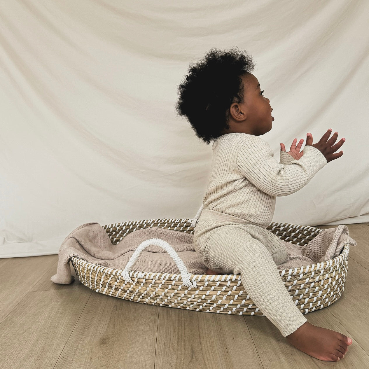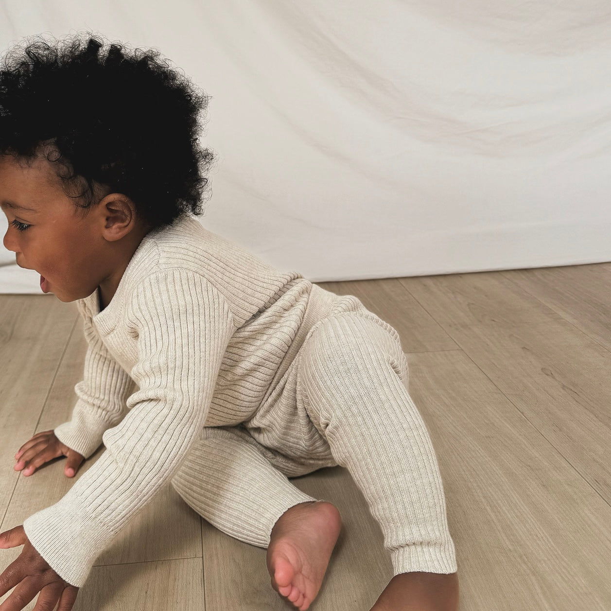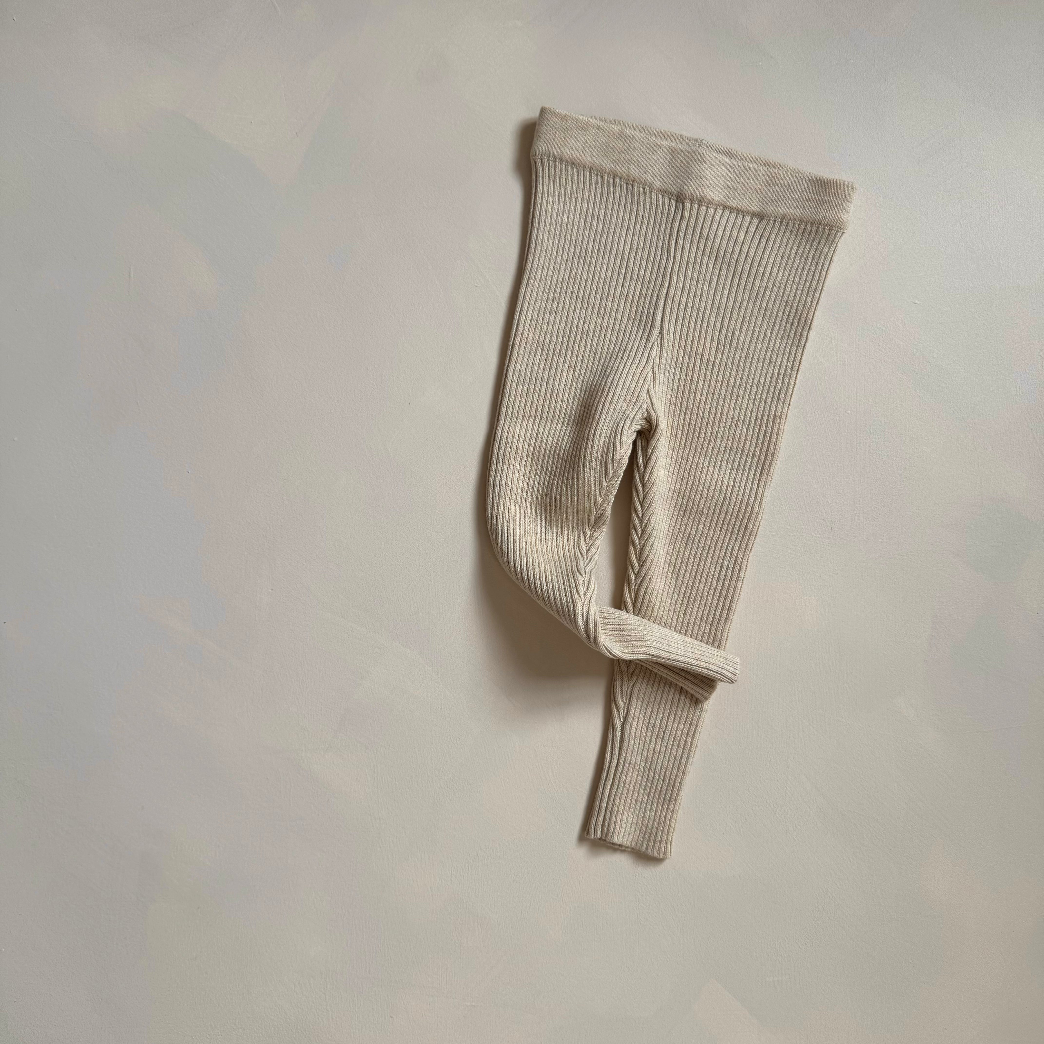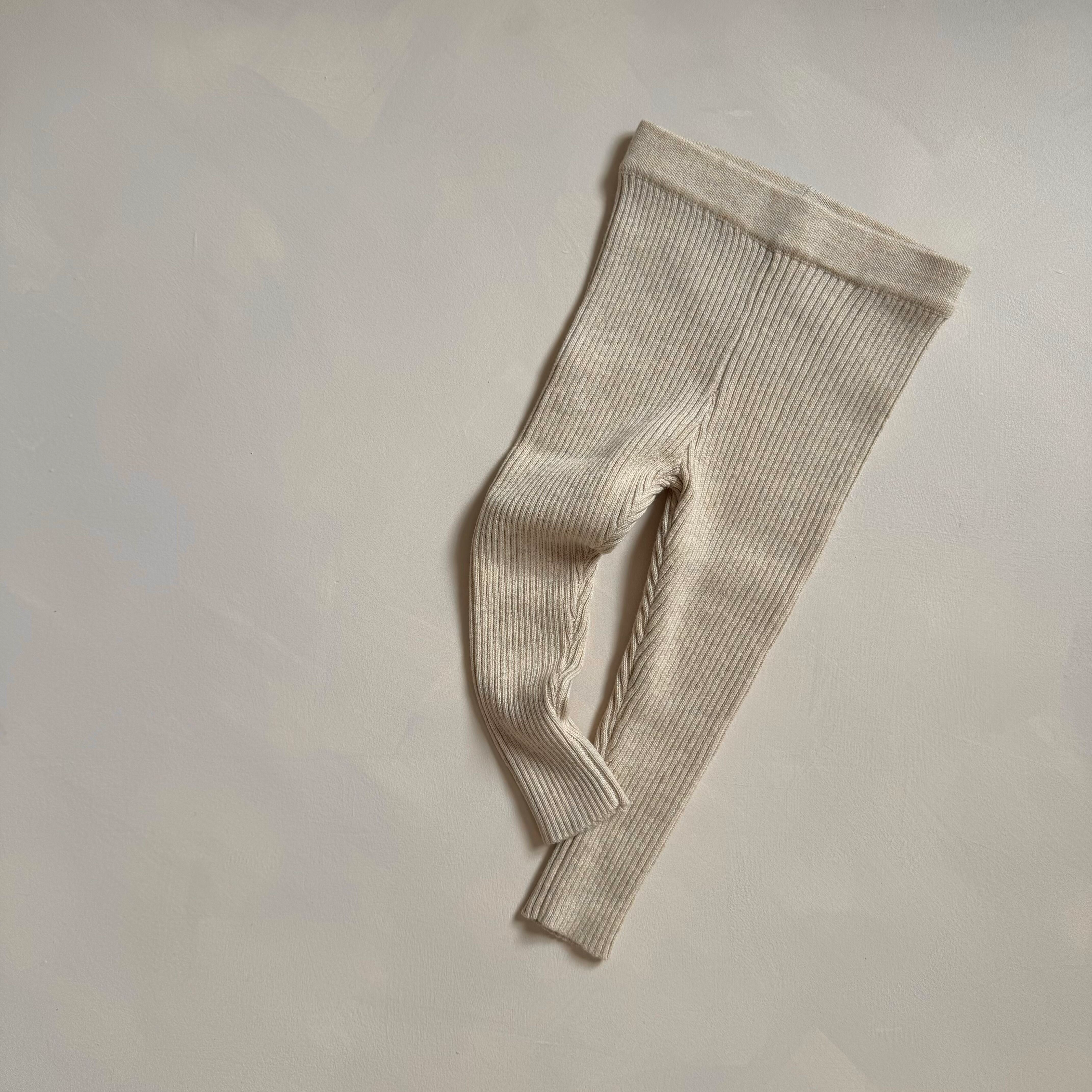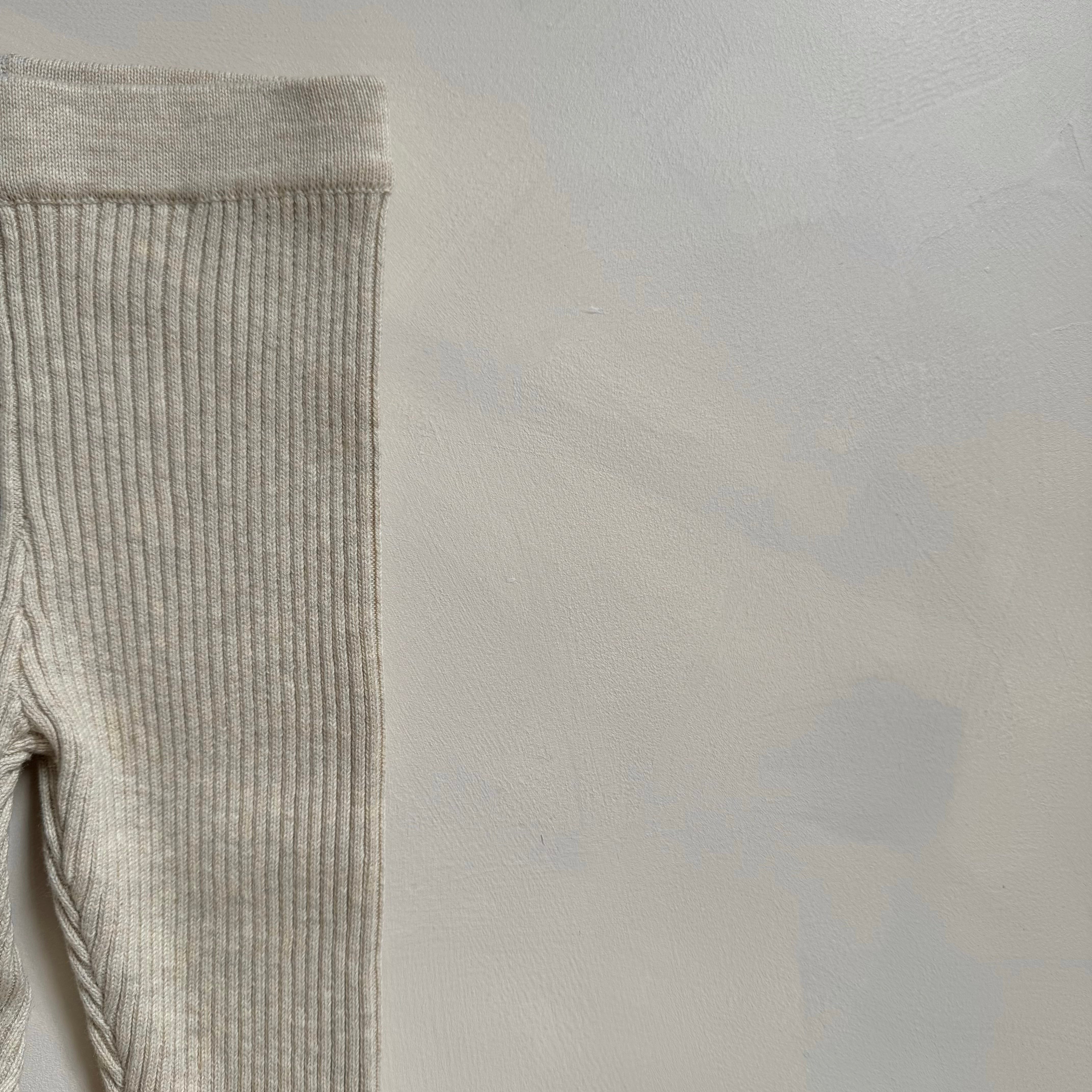 100% cotton leggings with a rib texture in a perfect neutral 'wheat' shade. A slim fit style which due to the nature if the cotton fabric will become looser with wear. Elasticated at the waist.