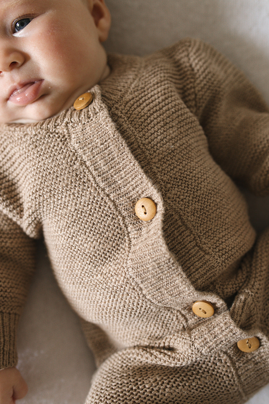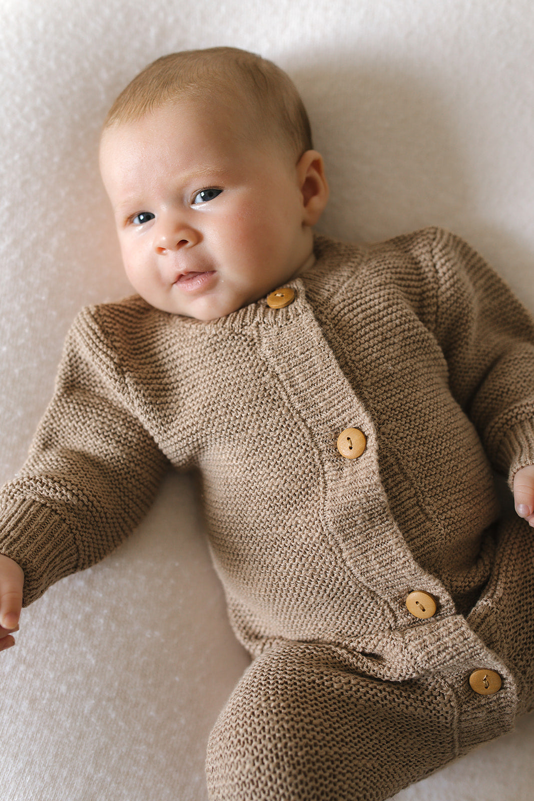Cosy Teddy textured knit romper ideal for keeping babies warm and snug in the coming season. With wooden button fastening down the front and lightly elasticated cuffs and ankles for a flattering fit.