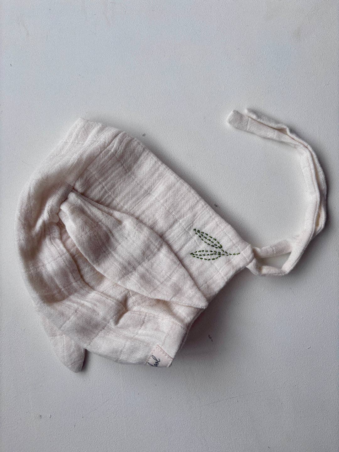 The organic cotton muslin bonnet is designed to frame little faces gently while offering light protection from sun and breeze. Finished with subtle bunny ears and a hand embroidered olive sprig, it blends playfulness with meaning, innocence paired with peace. Each bonnet is crafted in breathable organic cotton muslin and embroidered by hand, making every piece slightly unique.