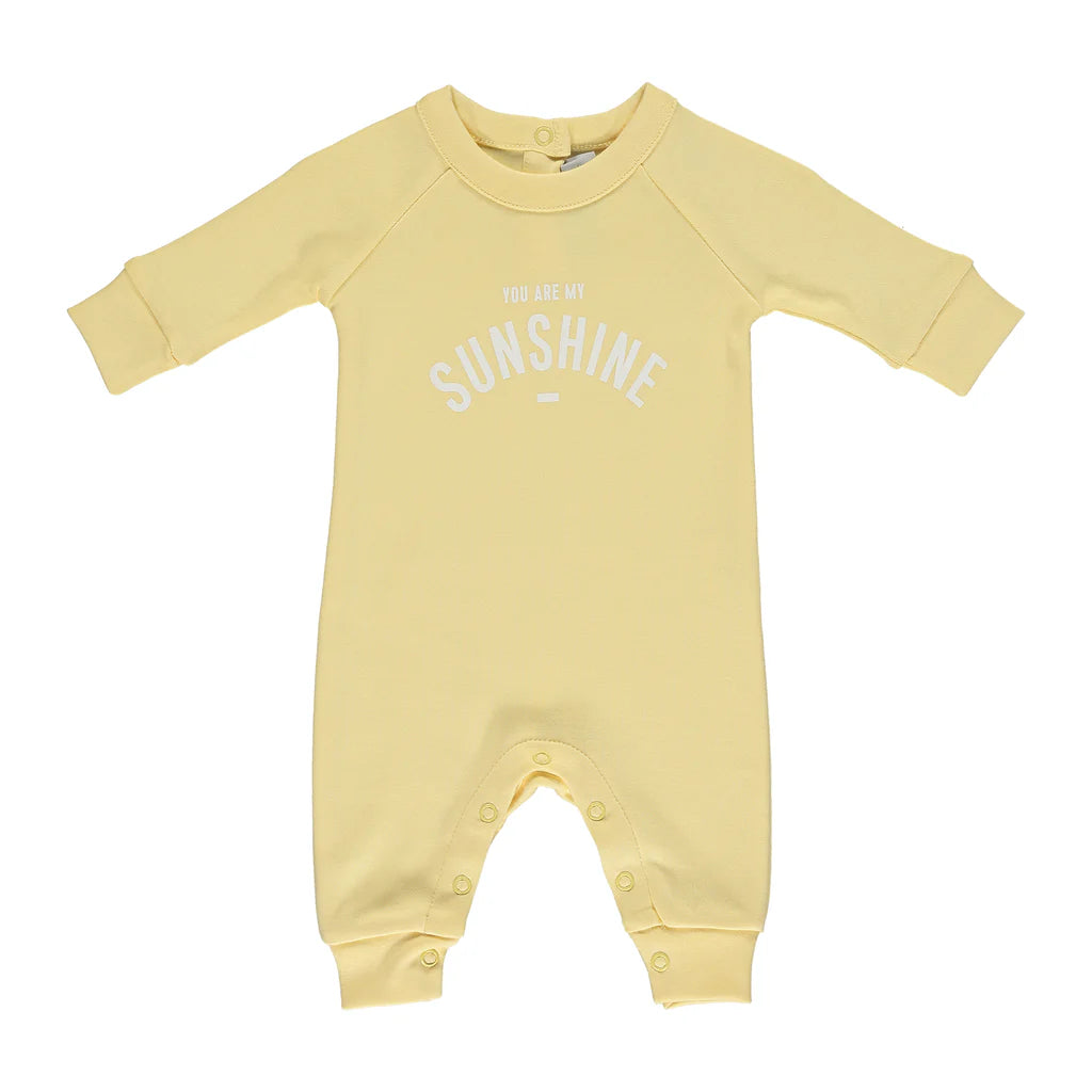 Sherbet yellow cotton all-in-one featuring a white 'You Are My Sunshine' slogan.