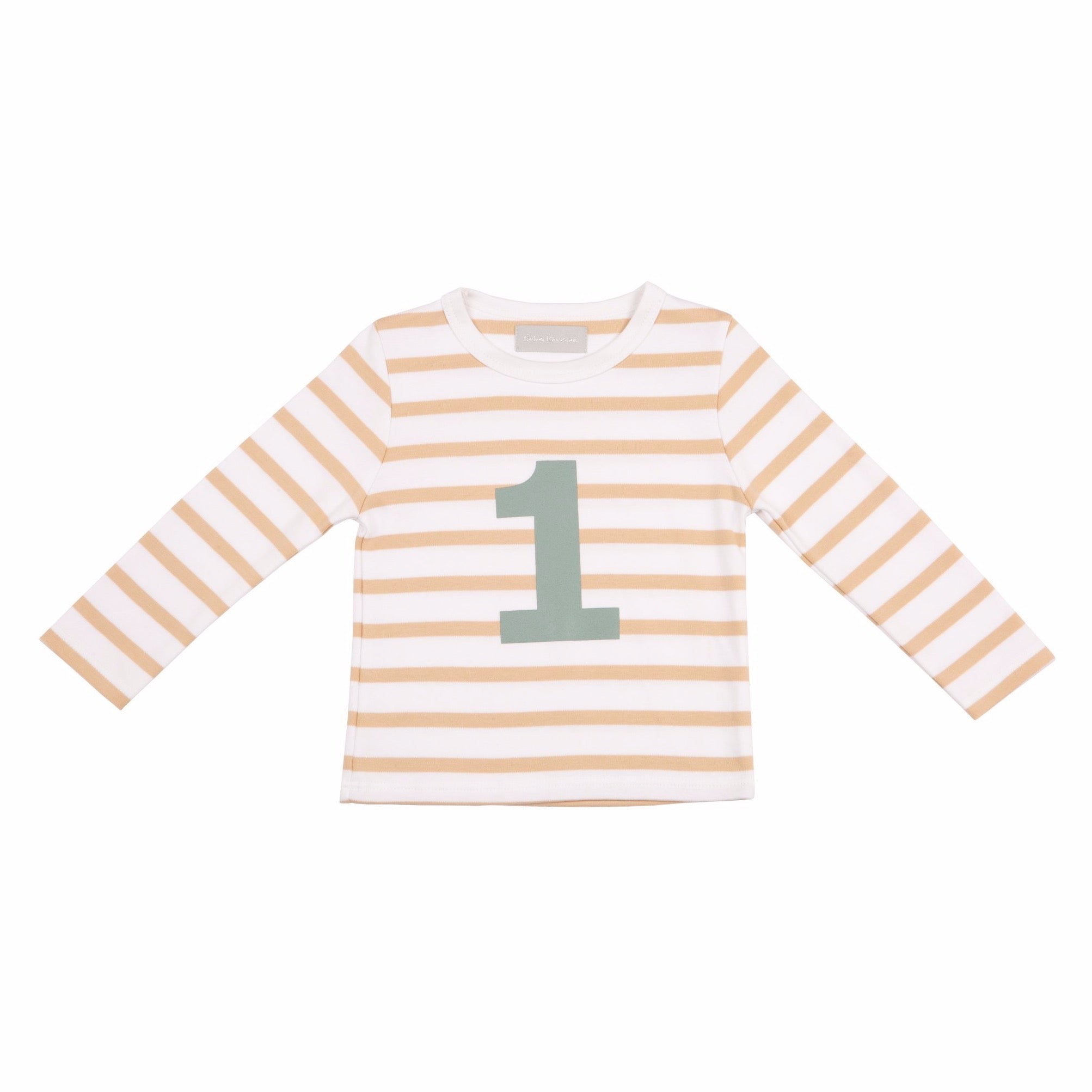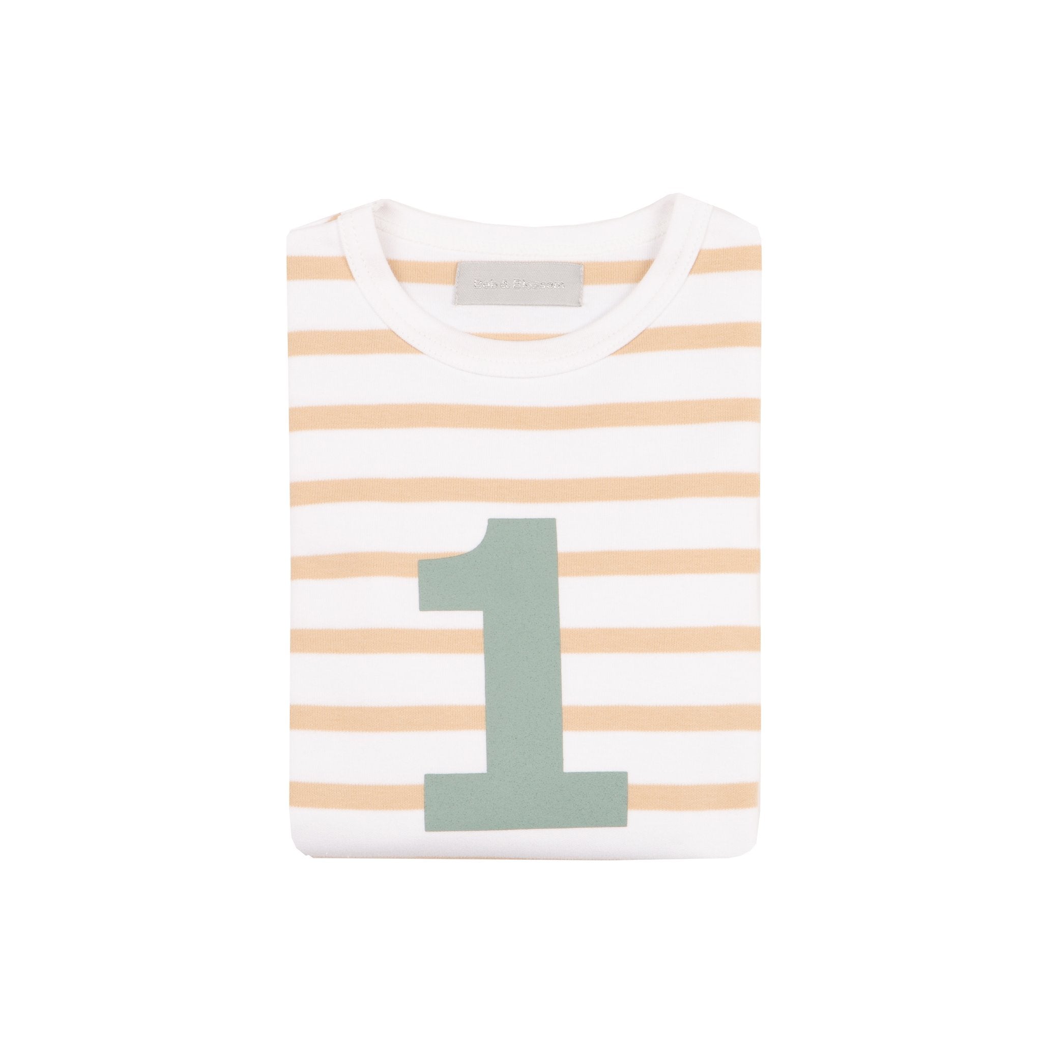 Biscuit & white breton striped cotton T shirt, featuring a green number 1 screen print. The perfect birthday gift, can be worn on the big day and throughout the year until the next big day comes around!