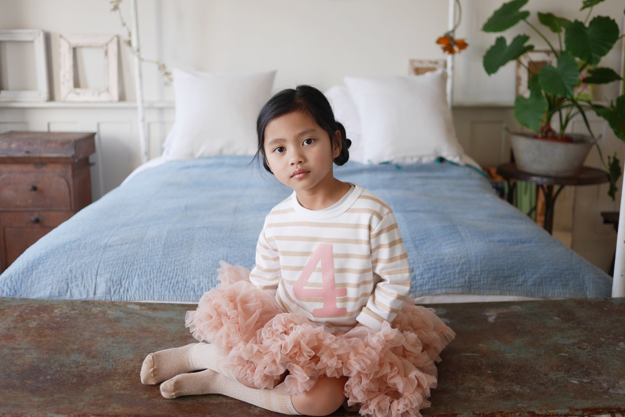Biscuit & white breton striped cotton T shirt, featuring a pink number 4 screen print. The perfect birthday gift, can be worn on the big day and throughout the year until the next big day comes around!