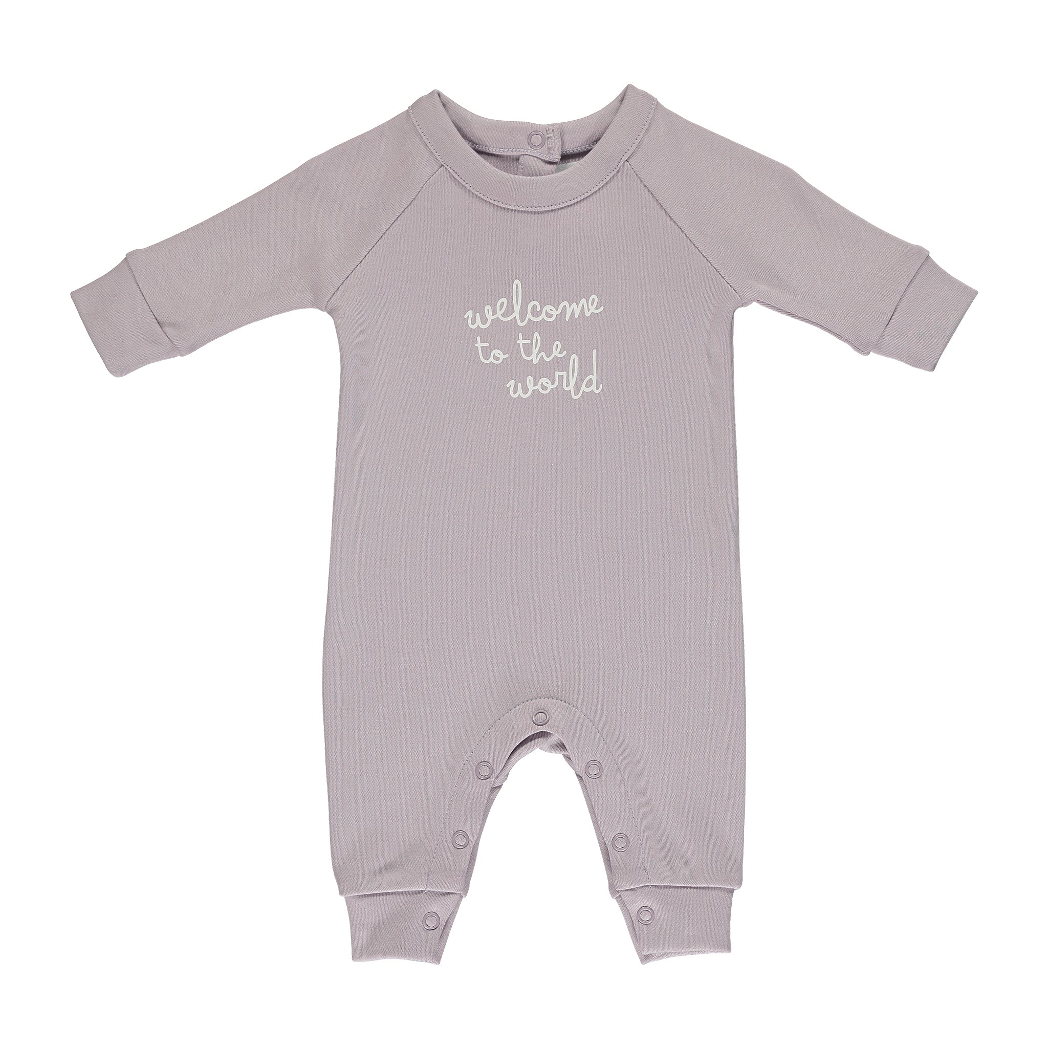 Heather cotton all-in-one featuring a white 'Welcome to the World' print.