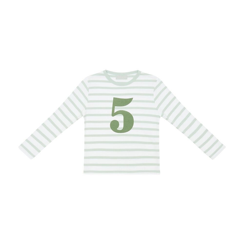 Powder blue & white breton striped cotton T shirt, featuring an olive green number 5 screen print. The perfect birthday gift, can be worn on the big day and throughout the year until the next big day comes around!