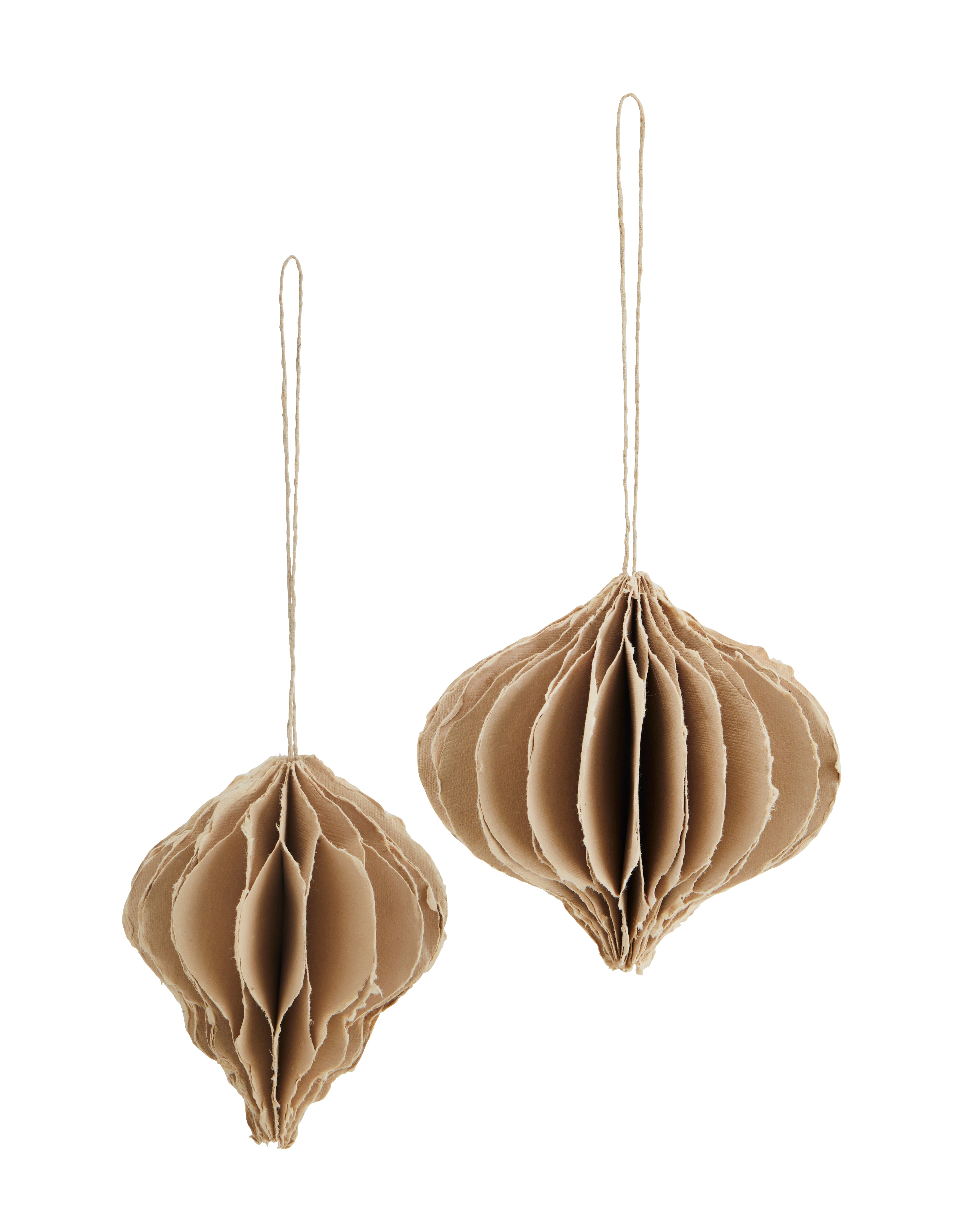 Set of two hanging paper decorations made from recycled cotton paper and jute strings.
