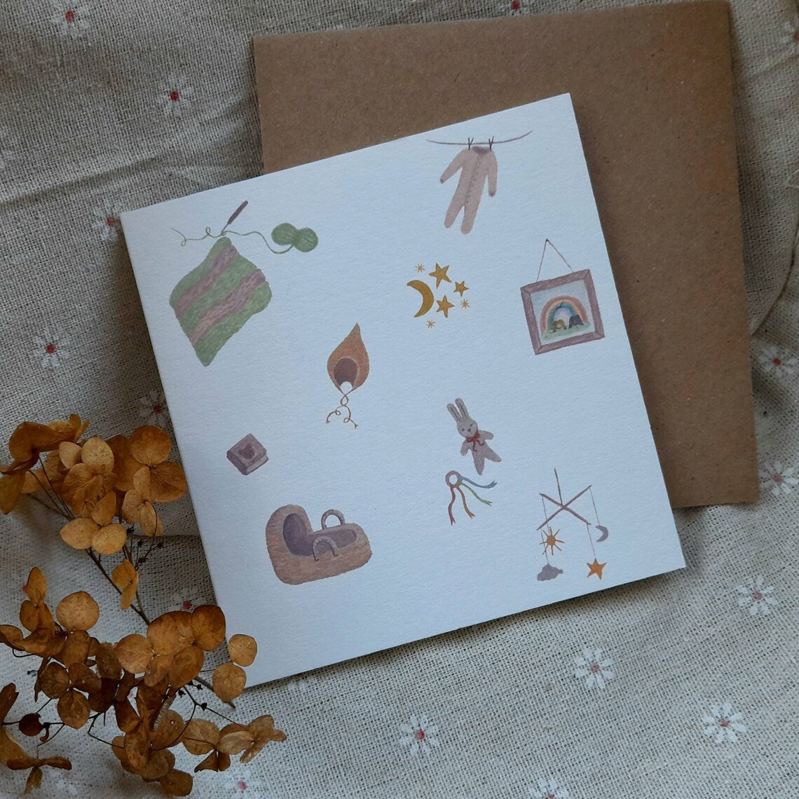 Beautiful keepsake greetings card designed by Lydia Everest. Blank on the inside for your personal message with a brown paper envelope.
