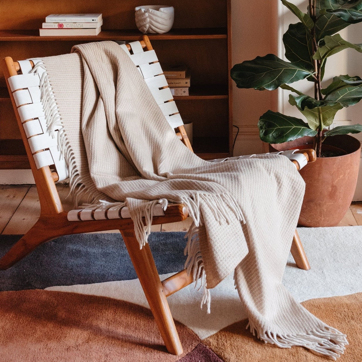 Beautiful wool waffle weave blanket made from recycled wool resulting in a dense twill weave brushed for texture. The soft waffle texture adds a modern edge as well as ensuring breathability making it the perfect extra layer over the bed.