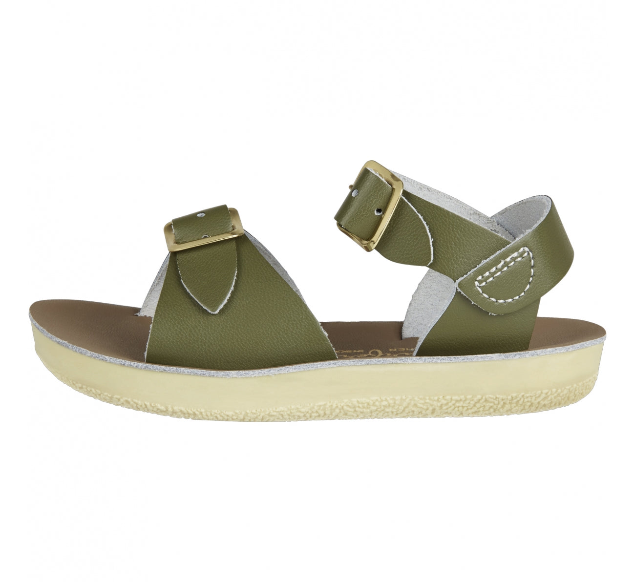 Introducing the Surfer in Olive. Our bestselling Surfer style is now available in Olive - perfect for little boys and girls and super stylish. The Surfer is a classic two strap sandal which is made from the same waterproof leather and rust proof buckles as all of our sandals. a super comfortable spongy urethane sole with rust proof buckles. They can be worn in water and handwashed with a gentle detergent. The Sun-San Surfer is your classic two strap Jesus sandal. The adjustable toe buckle and ankle strap makes it the best all-rounder for both wide and narrow feet.
