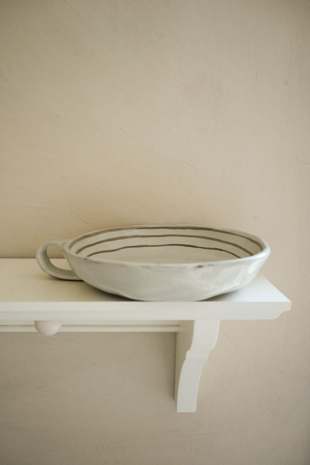 Shallow bowl with handle and hand painted Breton stripes around the rim.