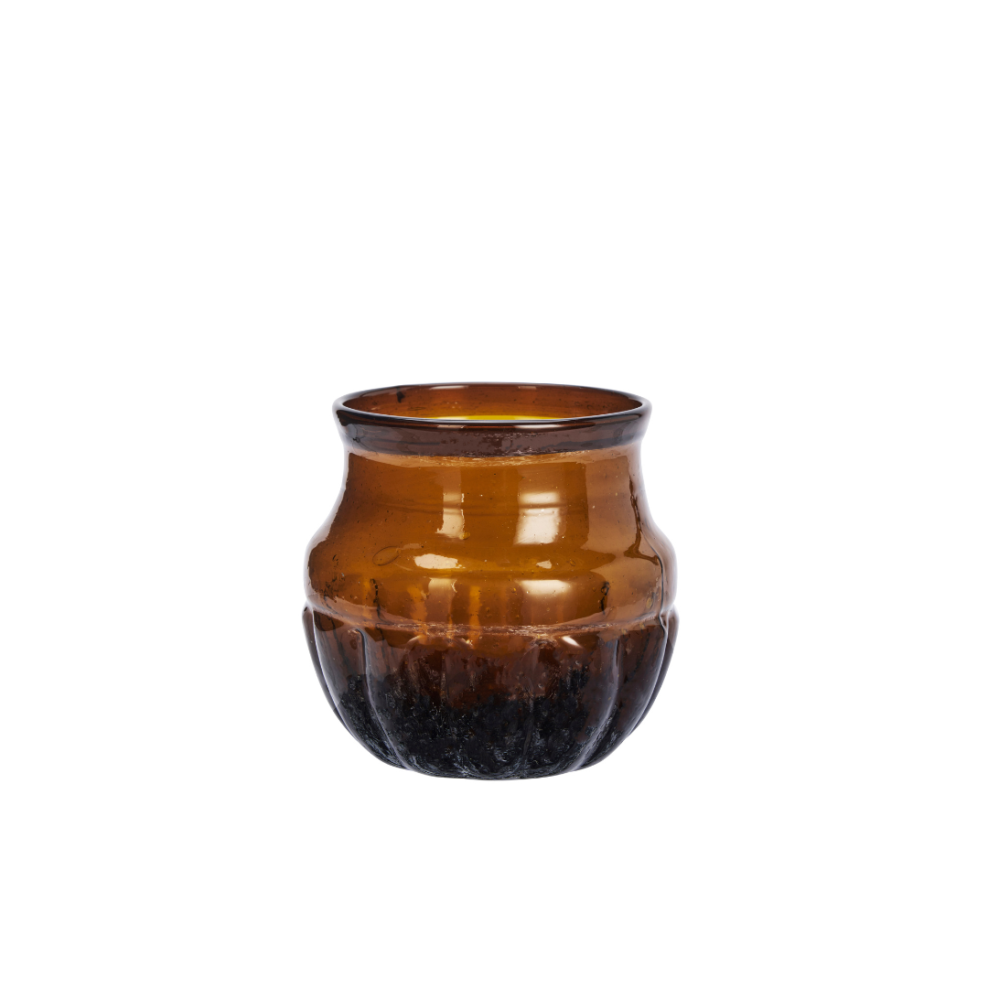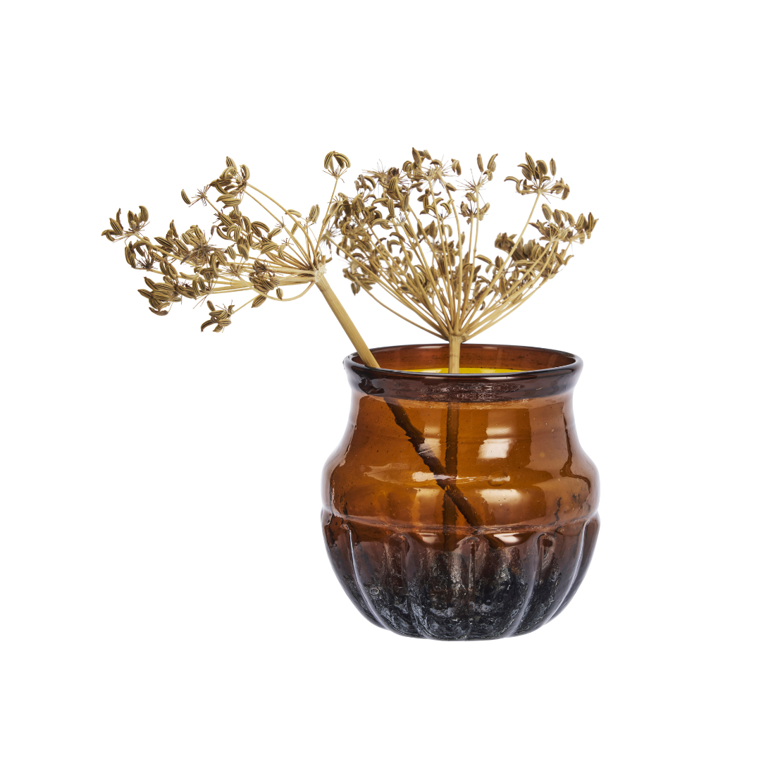 Crafted from 100% recycled glass in Firozabad, India, a renowned centre for glass manufacturing. Its warm brown color brings an earthy touch to any environment. Designed for versatility, it suits smaller, low floral arrangements and can also hold small pillar candles. The recycled nature of the glass means each piece may have slight variations, enhancing its unique appeal.