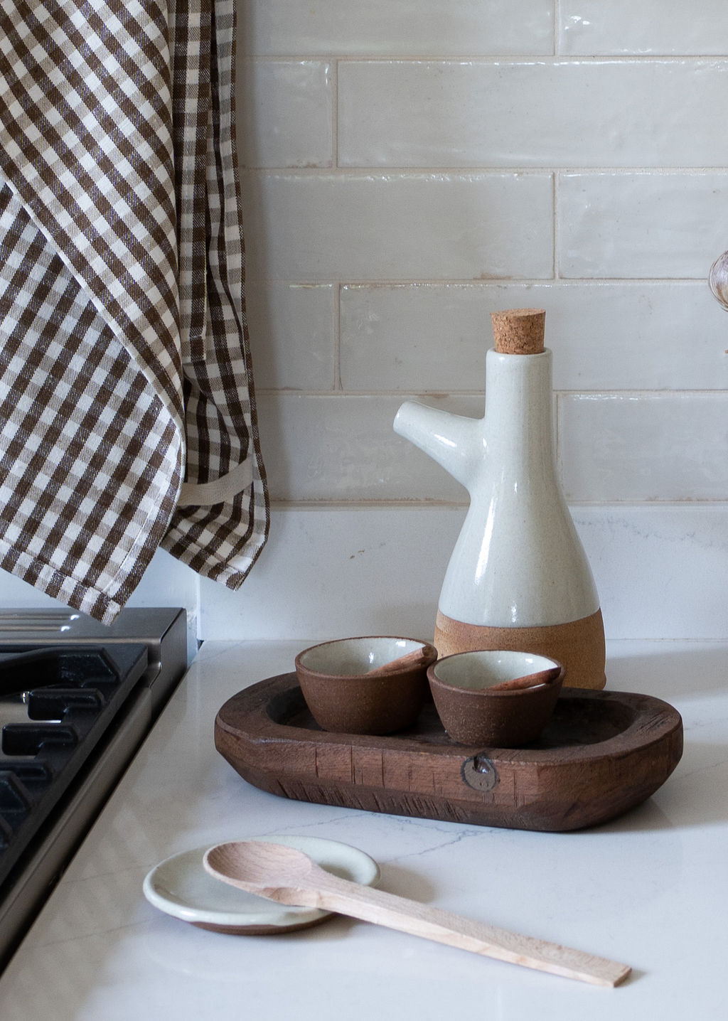 Made by hand in a small, artisan pottery in Southern India. Glazes are hand dipped so the finish will cary from piece to piece.