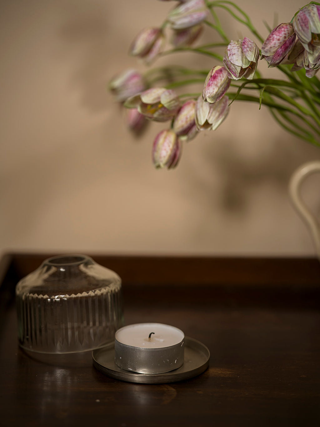 Handblown glass candle dome with a reeded finish cut by hand. The glass dome sits neatly on a brass plate which is designed to hold a single tea light. A beautiful home accessory which also makes a lovely gift.