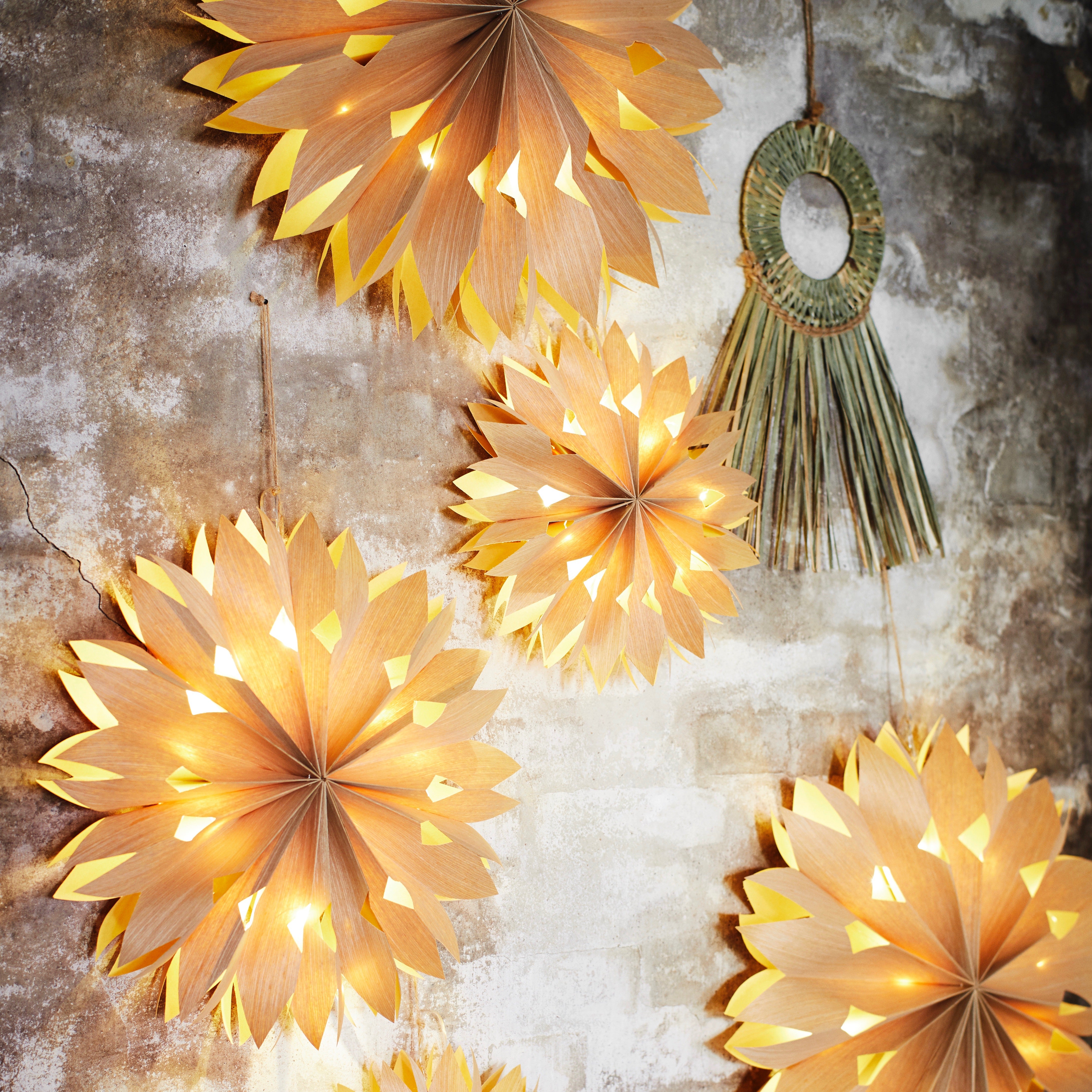 Large hanging paper star with wire lights woven through and jute string to hang.