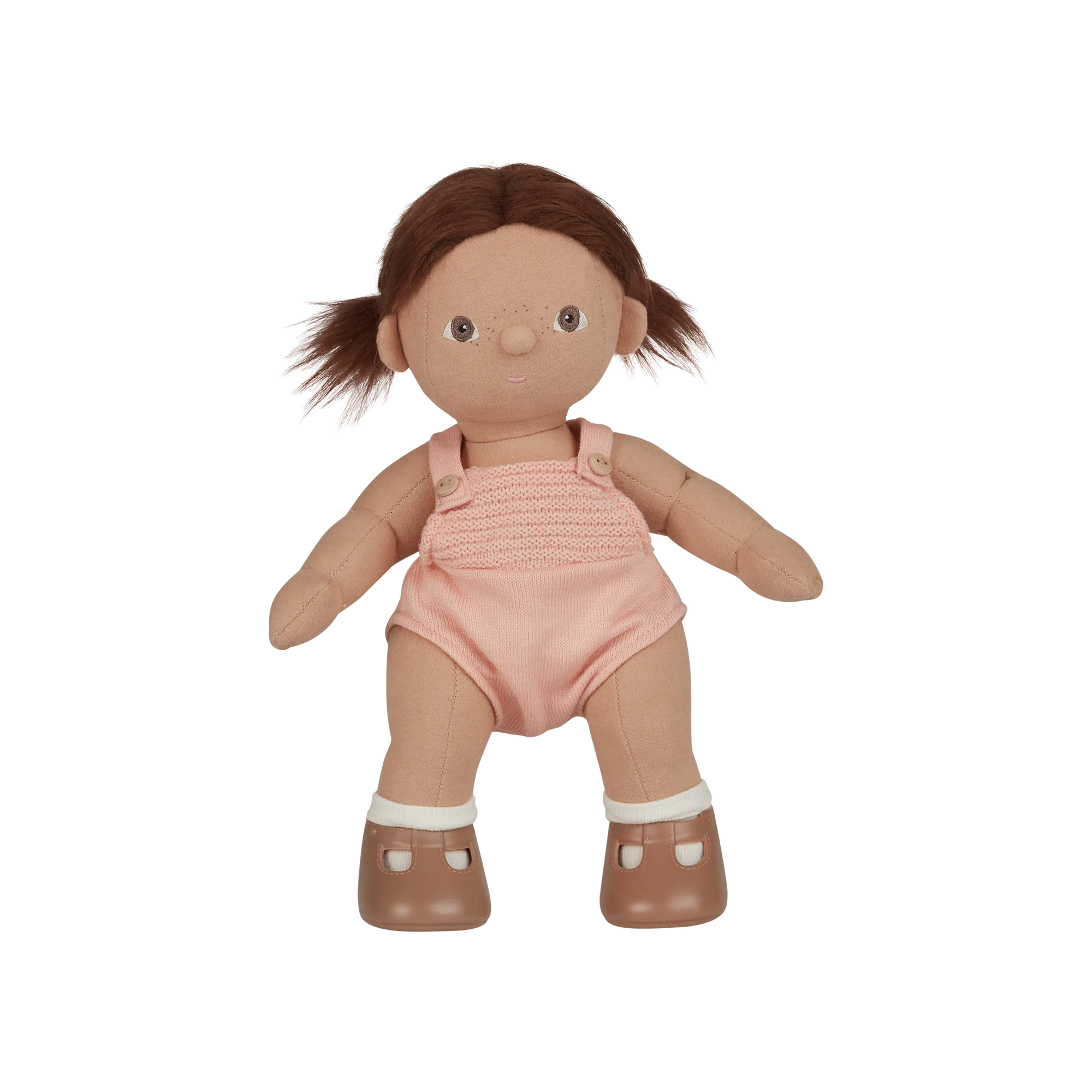 It's not just Dottie’s soft and snuggly body that make her the perfect doll-mate. With her cosy cotton body and soft brown hair, she’s simply made for cuddles. Snuggly, sweet, and always ready for fun, Dottie is dressed to charm in a pink romper with teeny wooden buttons and easy velcrofastenings for little hands. Whether it’s a nap, a tea party, or a grand adventure, Dottie’s ready to tag along and be your little one’s forever friend.
