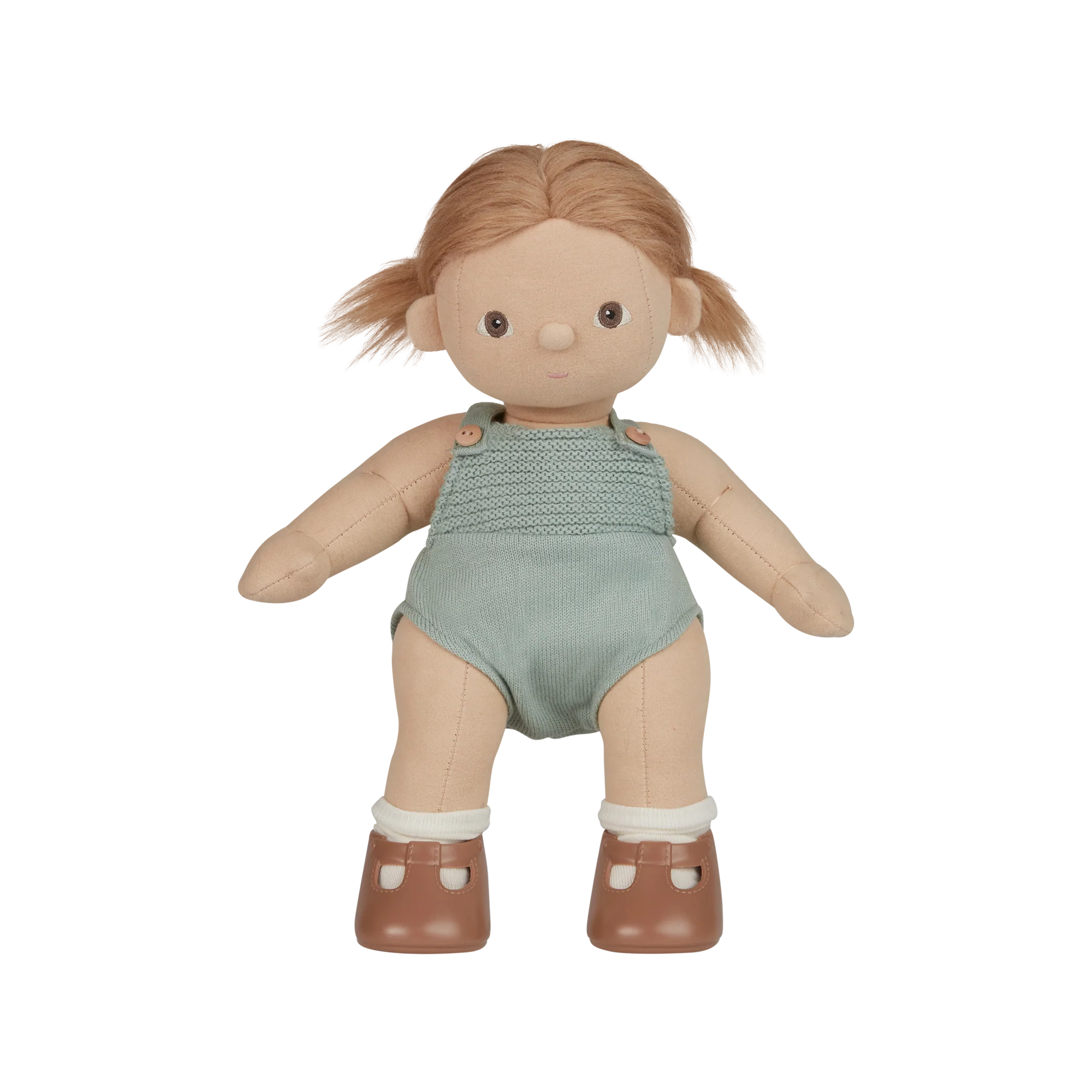 Gigi is all softness and sunshine! With her golden hair and cuddly body, Gigi’s as soft as a sunny day. She’s all dressed up in a powder-blue romper, complete with tiny wooden buttons and velcro fastenings, perfect for easy outfit changes. From giggles and games to bedtime snuggles, Gigi is more than a doll—she’s a playful pal and the cosiest companion for your little dreamer.