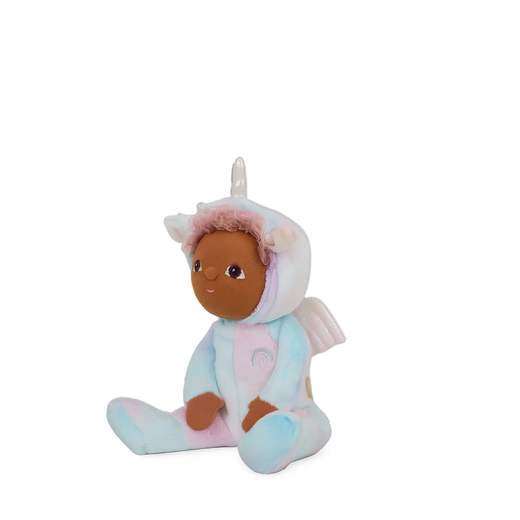Soft and cuddly, snuggled in a non-removable unicorn onesie with iridescent wings and horn.