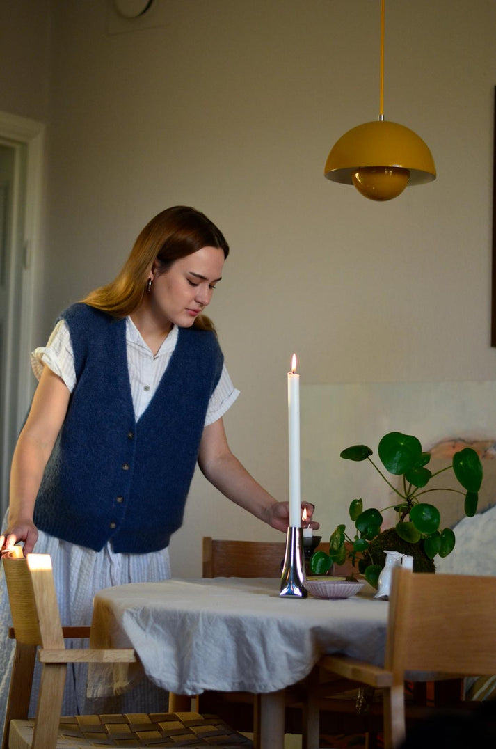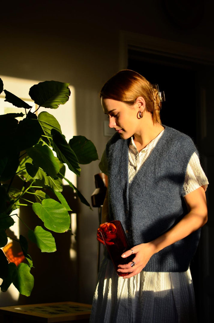 Care - We recommend a cold hand wash when needed. Hanging to air in a steamy bathroom should be enough to keep your knitted vest fresh and preserve the life of the garment.