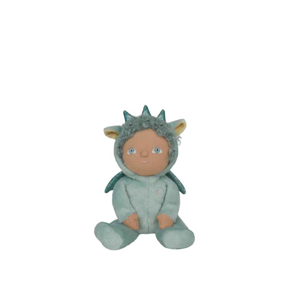 Soft and cuddly, snuggled in a non-removable dragon onesie with iridescent wings and horns.