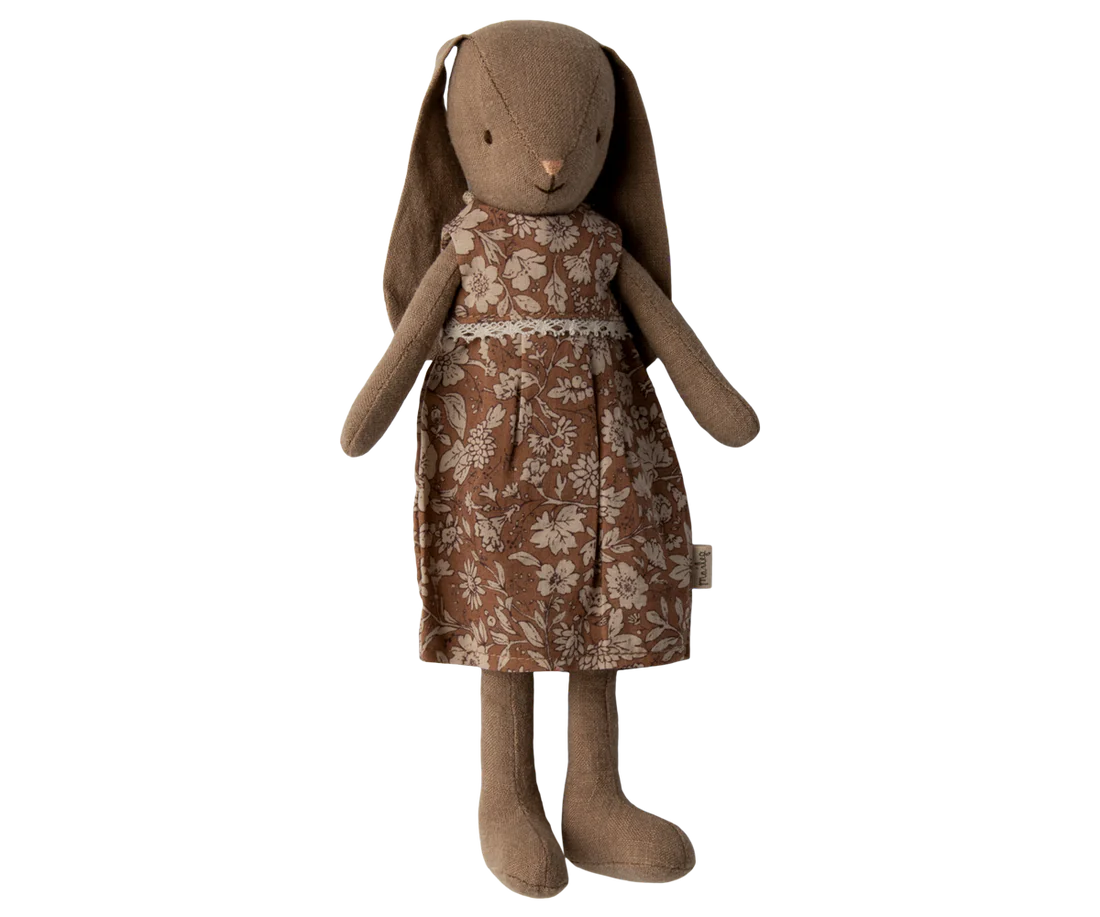 A classic bunny made of soft natural linen fabric that gives a lovely hand feel and look. This bunny is wearing a removable floral dress.