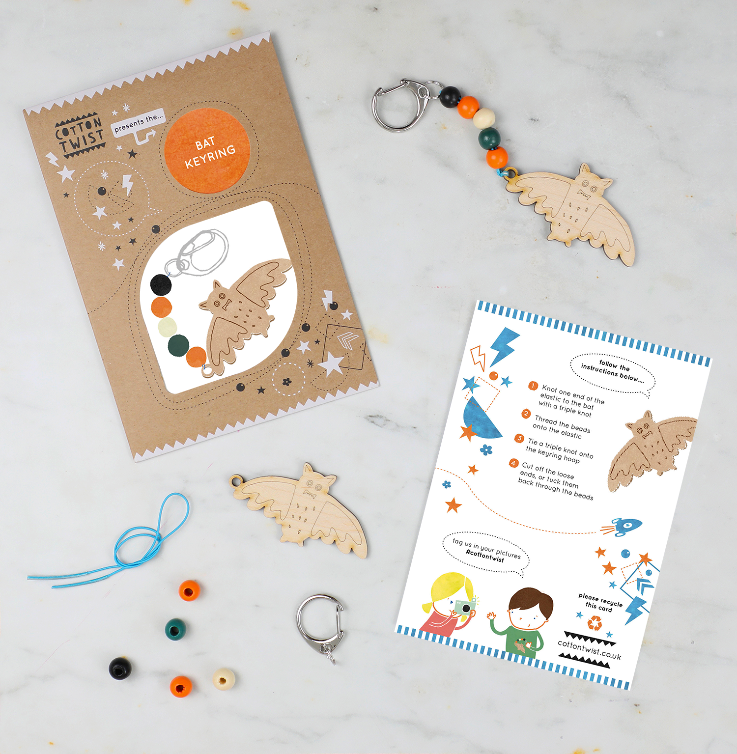 Children can make a Halloween Bat keyring with this solid maple wood bat and spherical beads. The elastic comes with metal ends to help children add beads with ease, & the keyring mechanism has a simple catch. In a bid to banish plastic from our homes, Cotton Twist products are lovingly assembled by hand, & all components are as good as we can possibly make them.