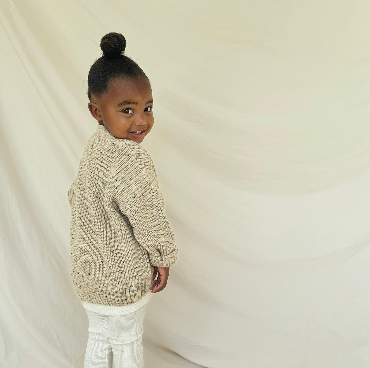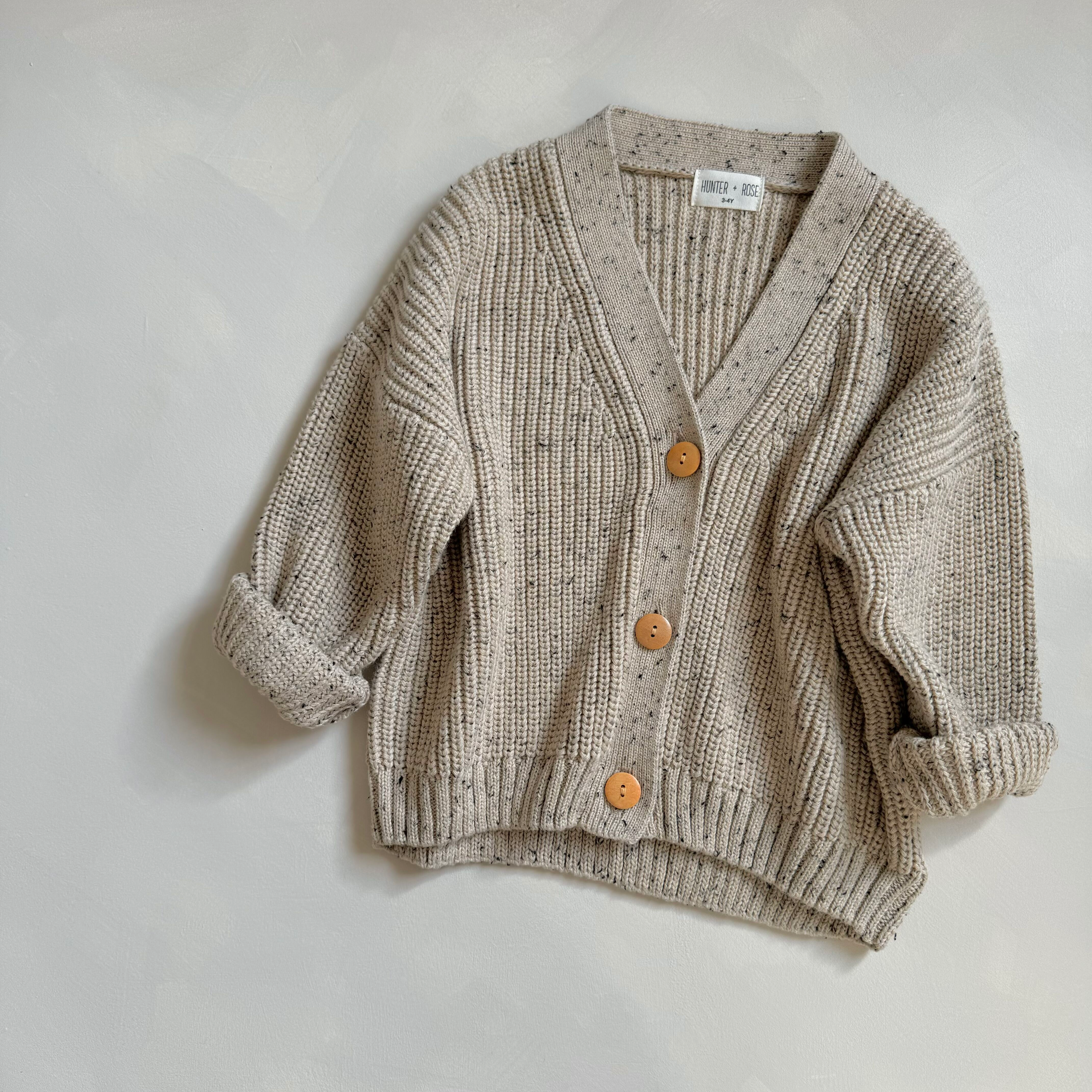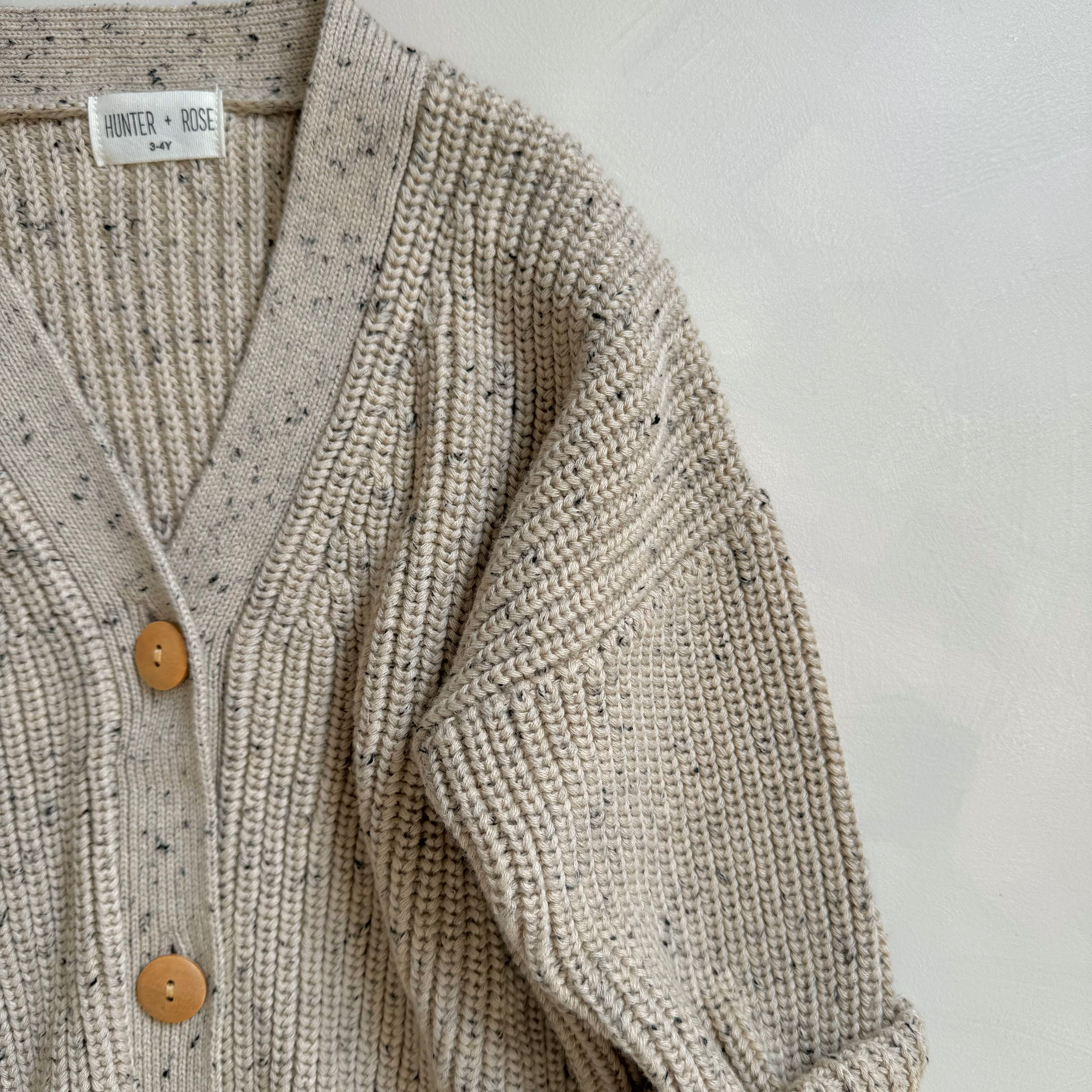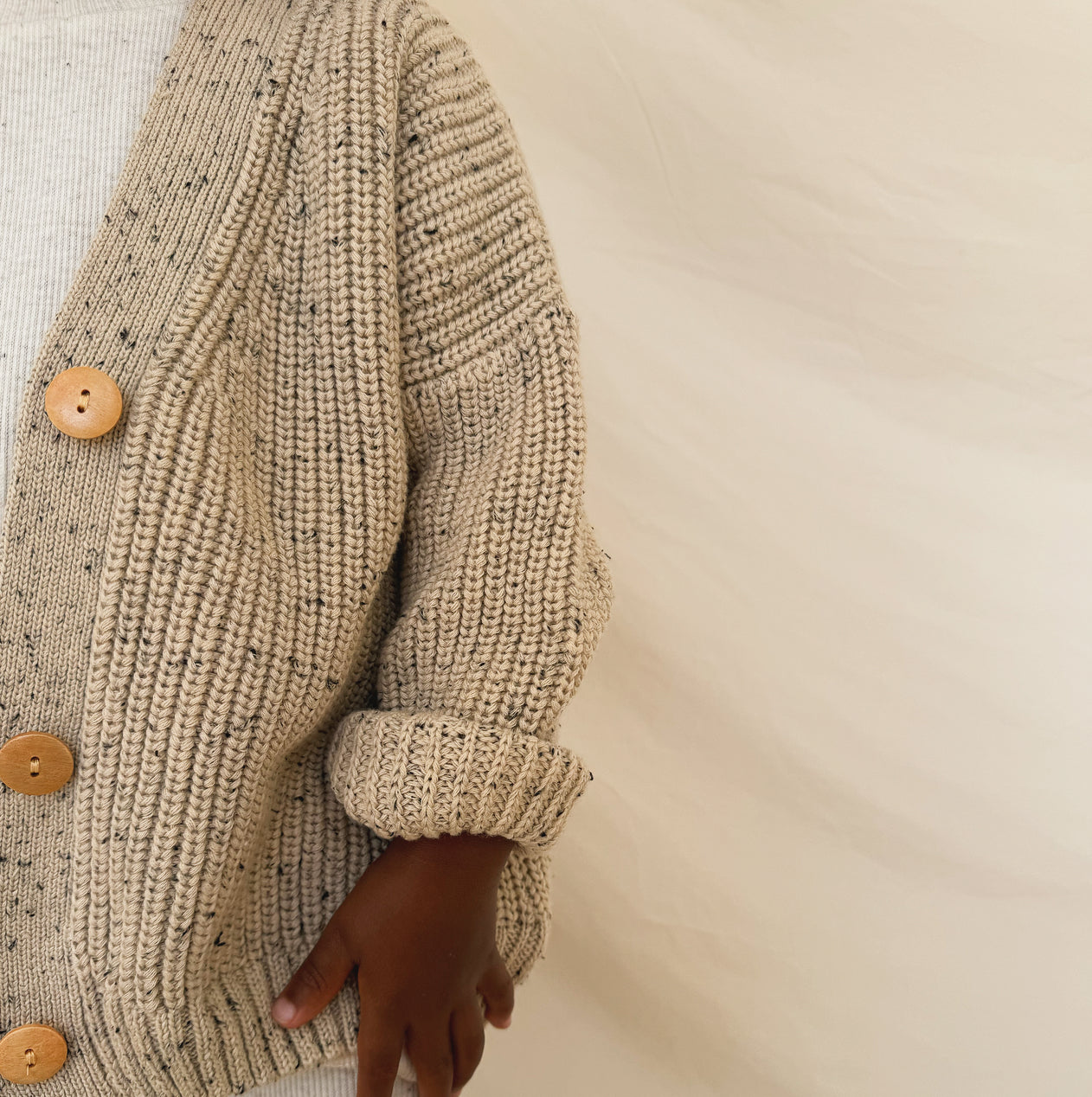 Oat Flecked Avery Cardigan made from 100% Cotton in a chunky ribbed knit. With wooden buttons to the front. This cardigan has a boxy, oversized fit.