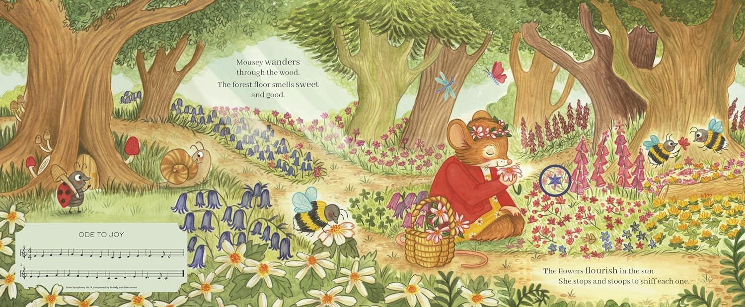 Join one little mouse for a musical birthday surprise, in this story book with eight sound clips, including Happy Birthday and famous classical melodies. Follow the little mouse, who wakes up on her birthday, goes out to pick flowers in the woods, then returns home to discover all her friends and family are ready to surprise her with a birthday party! Press the stars on the pages to hear the Blue Danube, Ode to Joy, William Tell Overture, Marriage of Figaro, and more.
