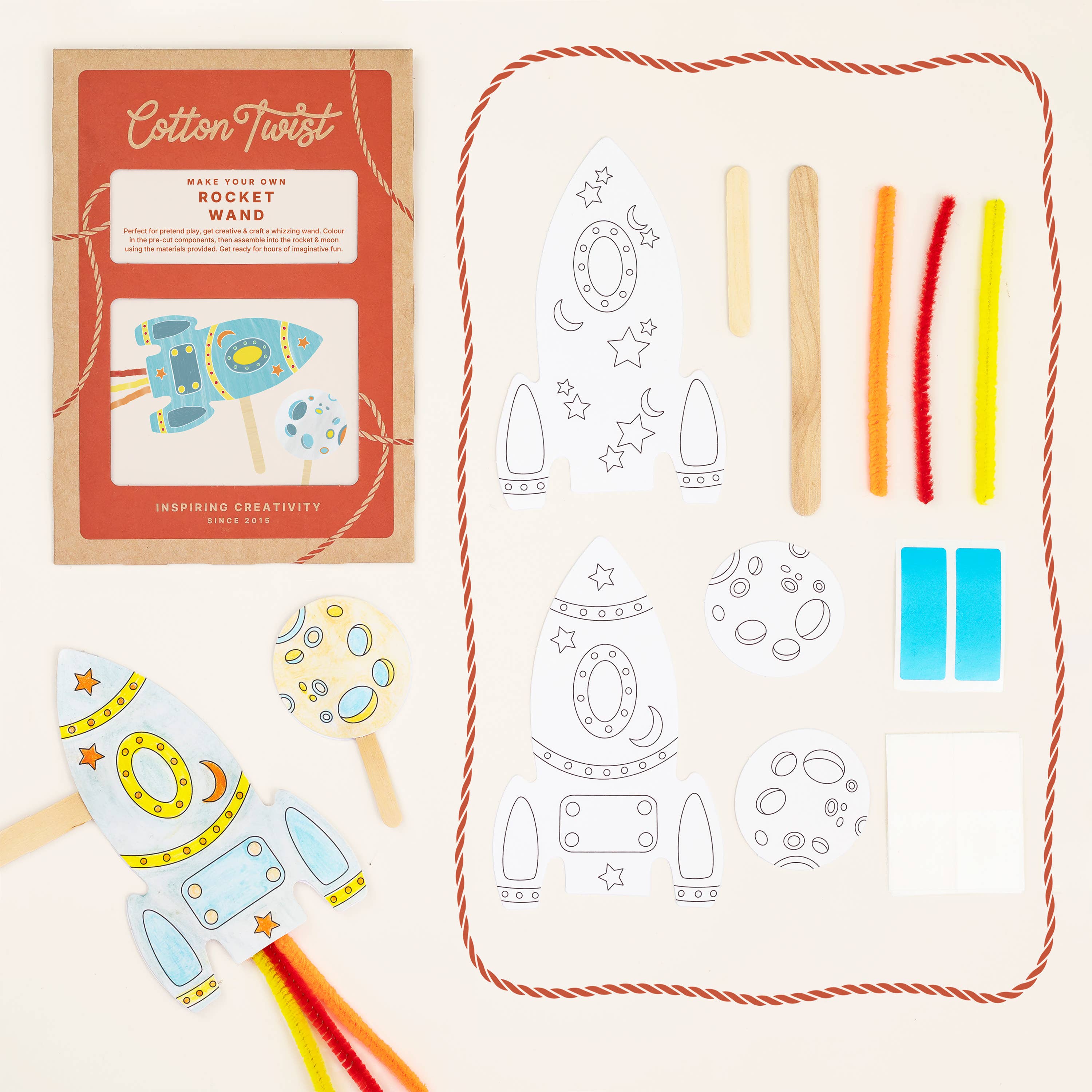 Children can construct their rocket using the cut outs provided. Once the pipe cleaners & lolly stick are taped on, the rocket sides can be coloured & stuck together. Whizz your rocket to the moon & back, then tell family & friends about your adventure.