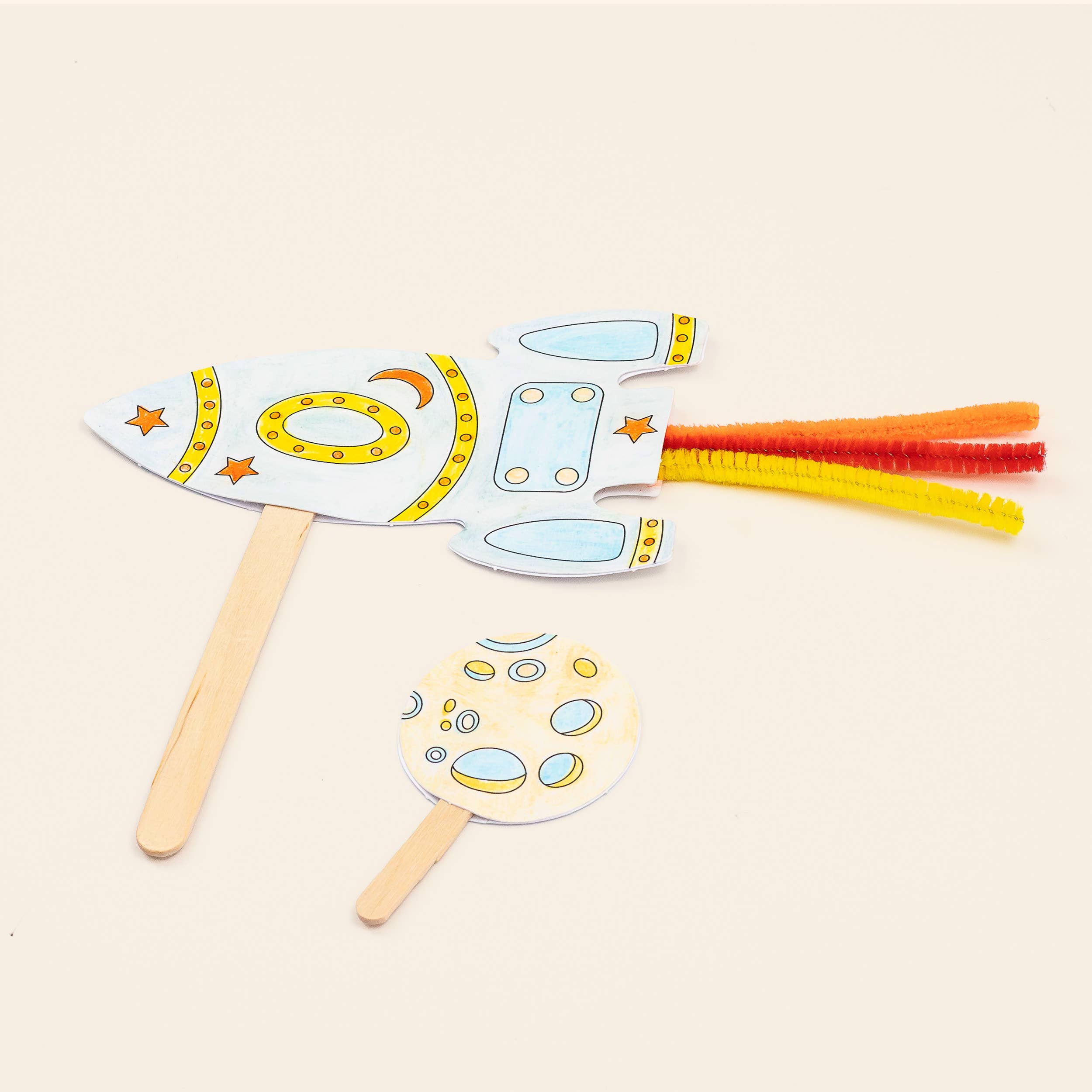 MATERIAL - rocket cut outs, lollipop stick, pipe cleaners, glue dots